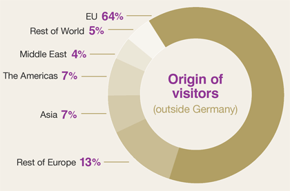 來(lái)自德國(guó)以外的參展商和觀眾的比例分別為48%34%,海外參展商的比例繼續(xù)有所增加,但海外觀眾的比例有輕微下跌。繼德國(guó)之后參展商最多的國(guó)家分別是:意大利、土耳其、中國(guó)、荷蘭、瑞士、西班牙、奧地利、法國(guó)和美國(guó)。繼德國(guó)之后觀眾最多的國(guó)家分別是:奧地利、荷蘭、瑞典、瑞士、英國(guó)、意大利、丹麥、比利時(shí)、印度、捷克共和國(guó)和波蘭。