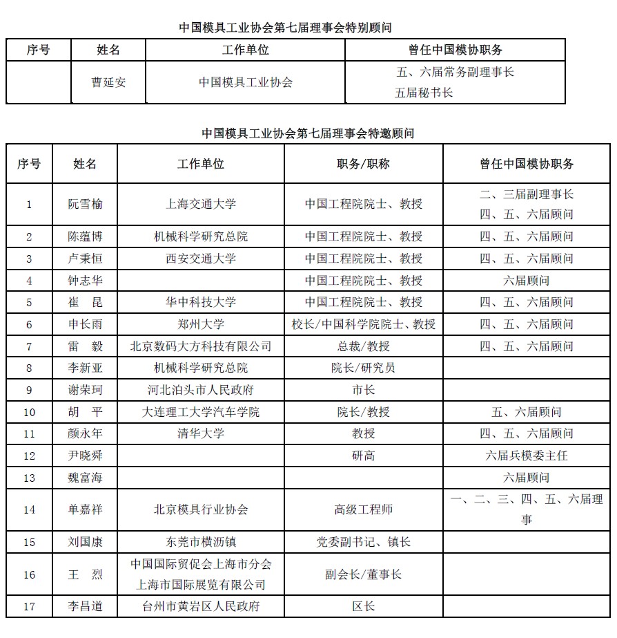 中國模具工業協會第七屆理事會特別顧問、特邀顧問名單