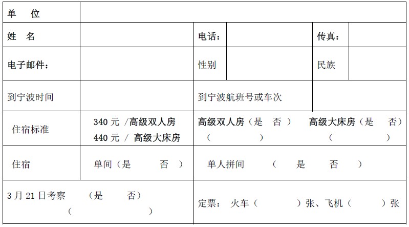 為了安排好與會代表在寧波的會議和隨后的參觀活動,請盡快確認(rèn)后務(wù)必將回執(zhí)于2014年3月10日前傳真至021-65124191