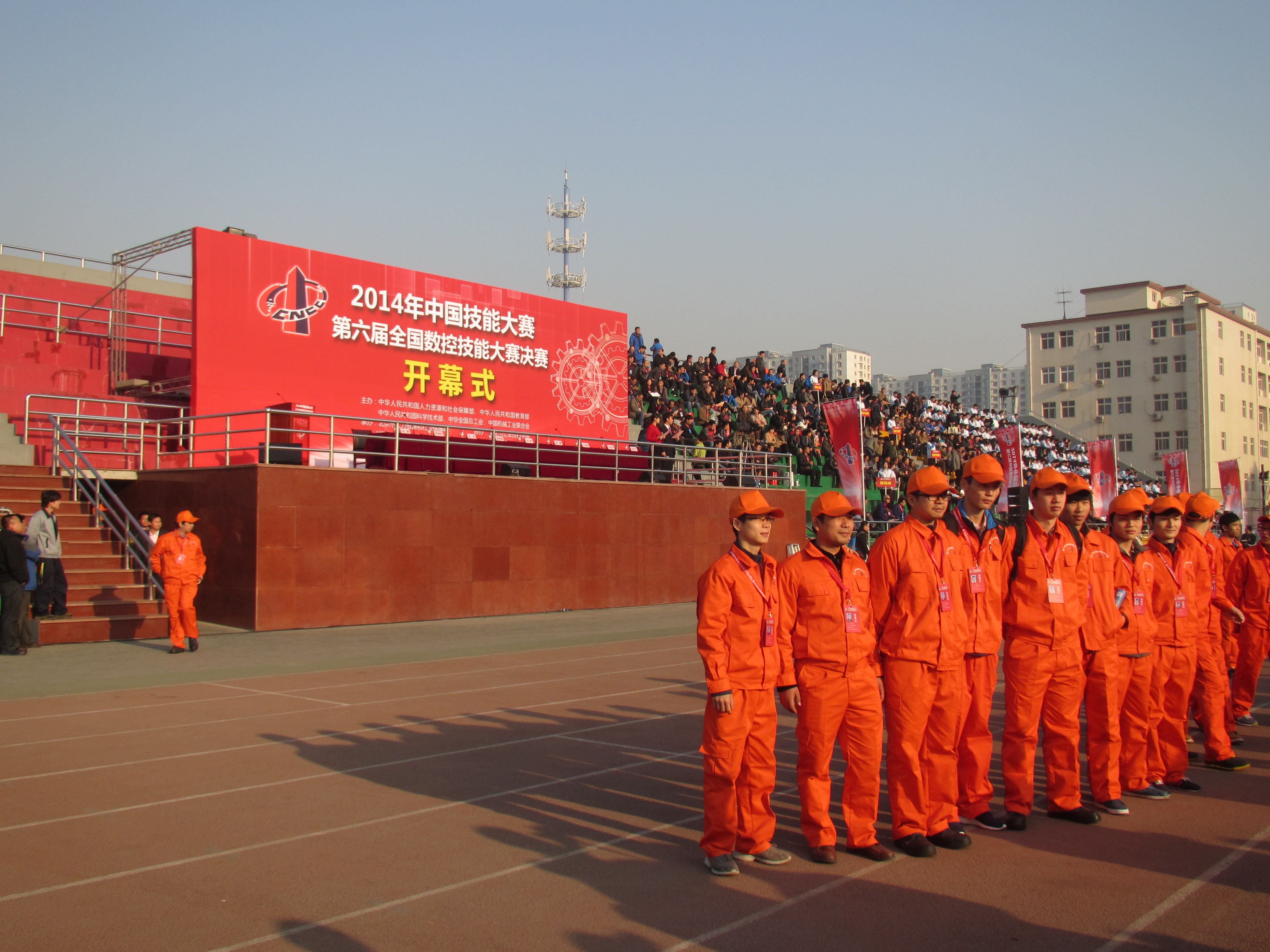 秋高氣爽、天高云淡,又是一年好時節。11月4日一大早,北京市工業技師學院的操場上彩旗飄飄,熱情洋溢、欣欣向榮。2014年中國技能大賽第六屆全國數控技能大賽決賽開幕式在此隆重舉行。來自國家人力資源和社會保障部、中國就業技術培訓指導中心、中國記協工業聯合會、教育部、中華全國總工會、北京市人力資源和社會保障局、科學技術部、北京化工集團的領導以及大賽專家裁判、各省市領隊教練與選手、世賽國家集訓隊選手、各技術廠商、媒體等近2000人出席了決賽的開幕式。