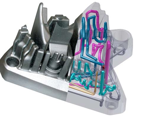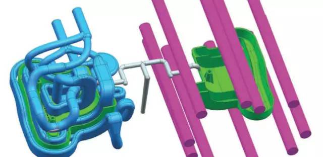 隨形冷卻是復雜模具設計的首選方式,如果冷卻水路距模具表面較近,則模具中積累的熱量就會大大減少,且熱量被限制在冷卻水道與模具表面之間的區(qū)域,使得從模具型腔表面向冷卻水路傳導熱量的路徑也縮短很多。冷卻通道可以被設計成復雜的異形,管道直徑可以不斷變化,根據(jù)冷卻要求,橫截面也可以是橢圓形或者方形。使用正確的計算和冷卻分析可以極大地優(yōu)化模具冷卻方式,從而縮短模具周期,提高部件質(zhì)量,特別是在易失真和變形區(qū)域。