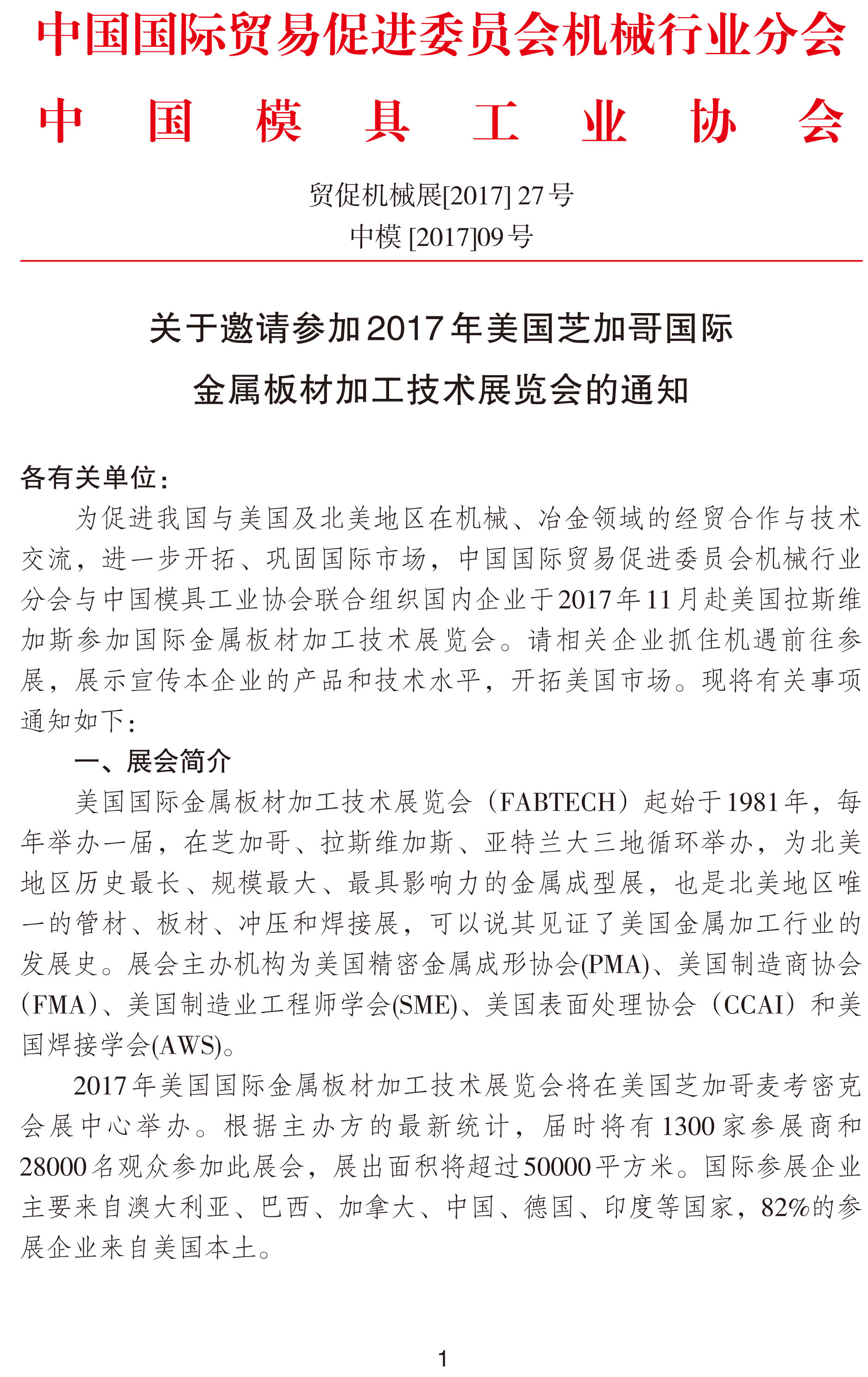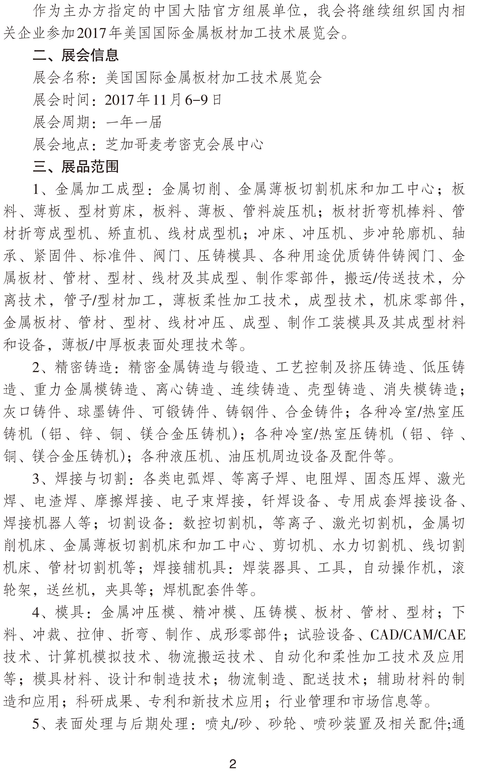 關于邀請參加2017年美國芝加哥國際金屬板材加工技術展覽會的通知
