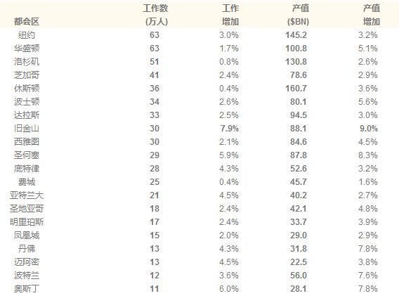 最大的20個(gè)先進(jìn)產(chǎn)業(yè)都會(huì)地區(qū)的數(shù)據(jù)和排名如下。工作數(shù)、產(chǎn)值來(lái)自2015年的數(shù)據(jù),增加值是指2013年到2015年的增加。