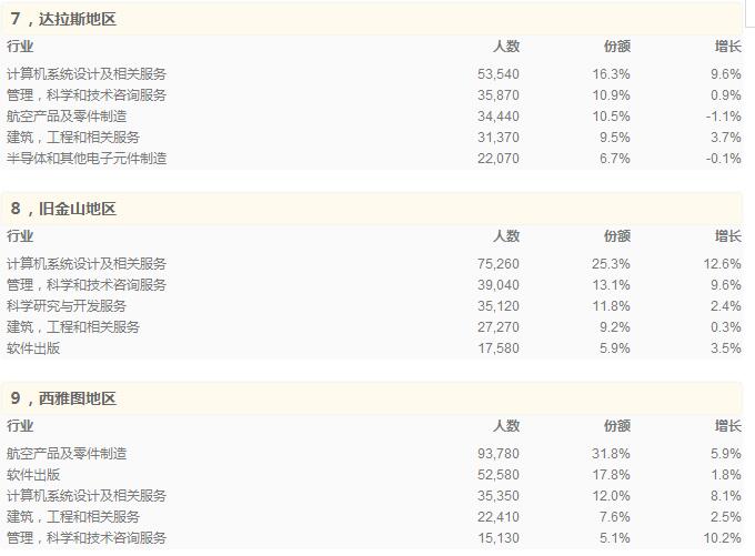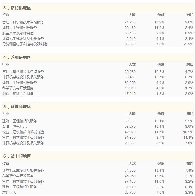 下面是最大的10個(gè)都會(huì)中心的最大的5個(gè)產(chǎn)業(yè)的細(xì)節(jié)。份額是指該行業(yè)人員占該地區(qū)先進(jìn)產(chǎn)業(yè)總?cè)藬?shù)的比例,增長(zhǎng)是指2013到2015年的增長(zhǎng)。