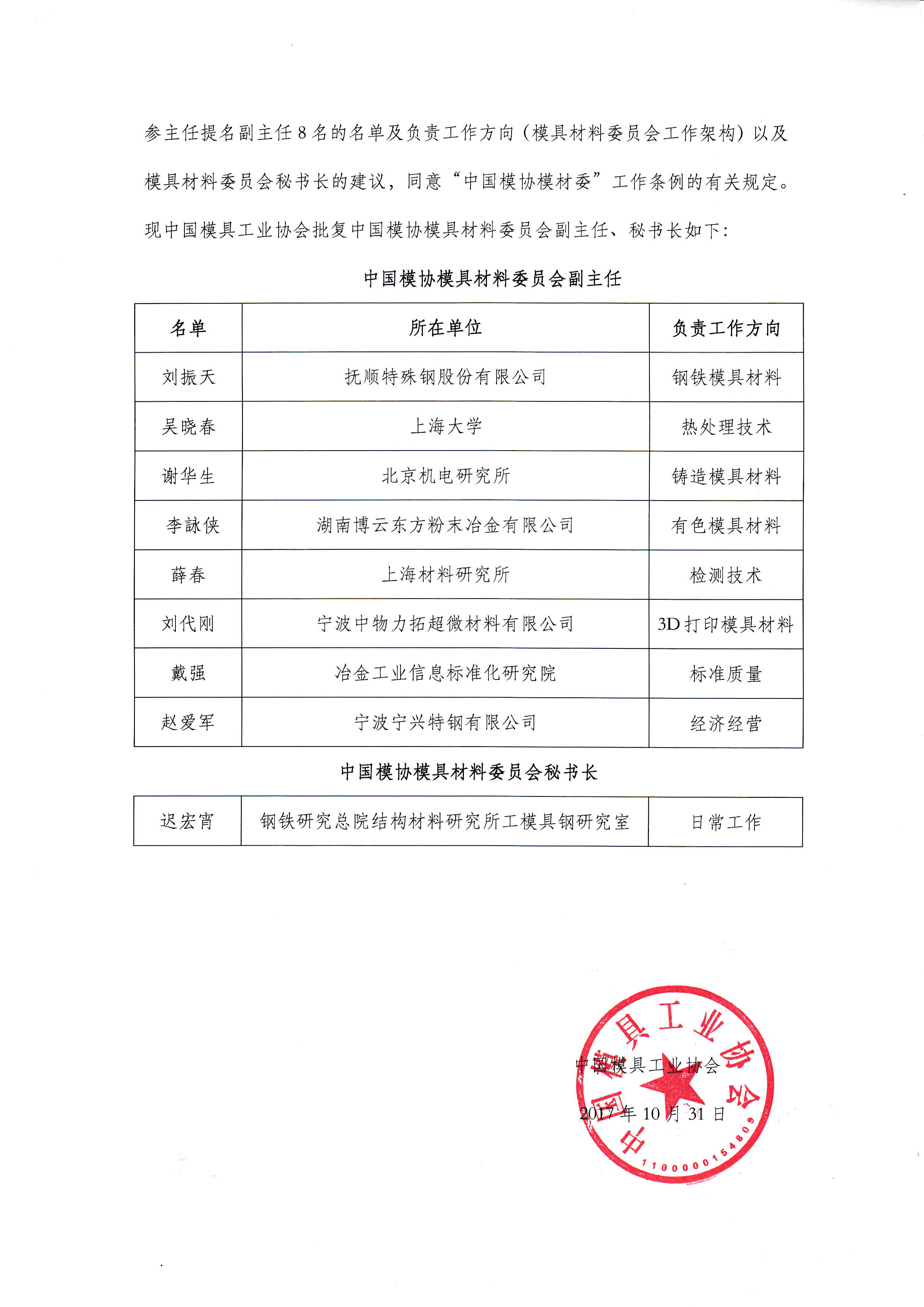 模具材料委員會(huì)關(guān)于新一屆副主任、秘書長(zhǎng)組成及工作架構(gòu)的批復(fù)