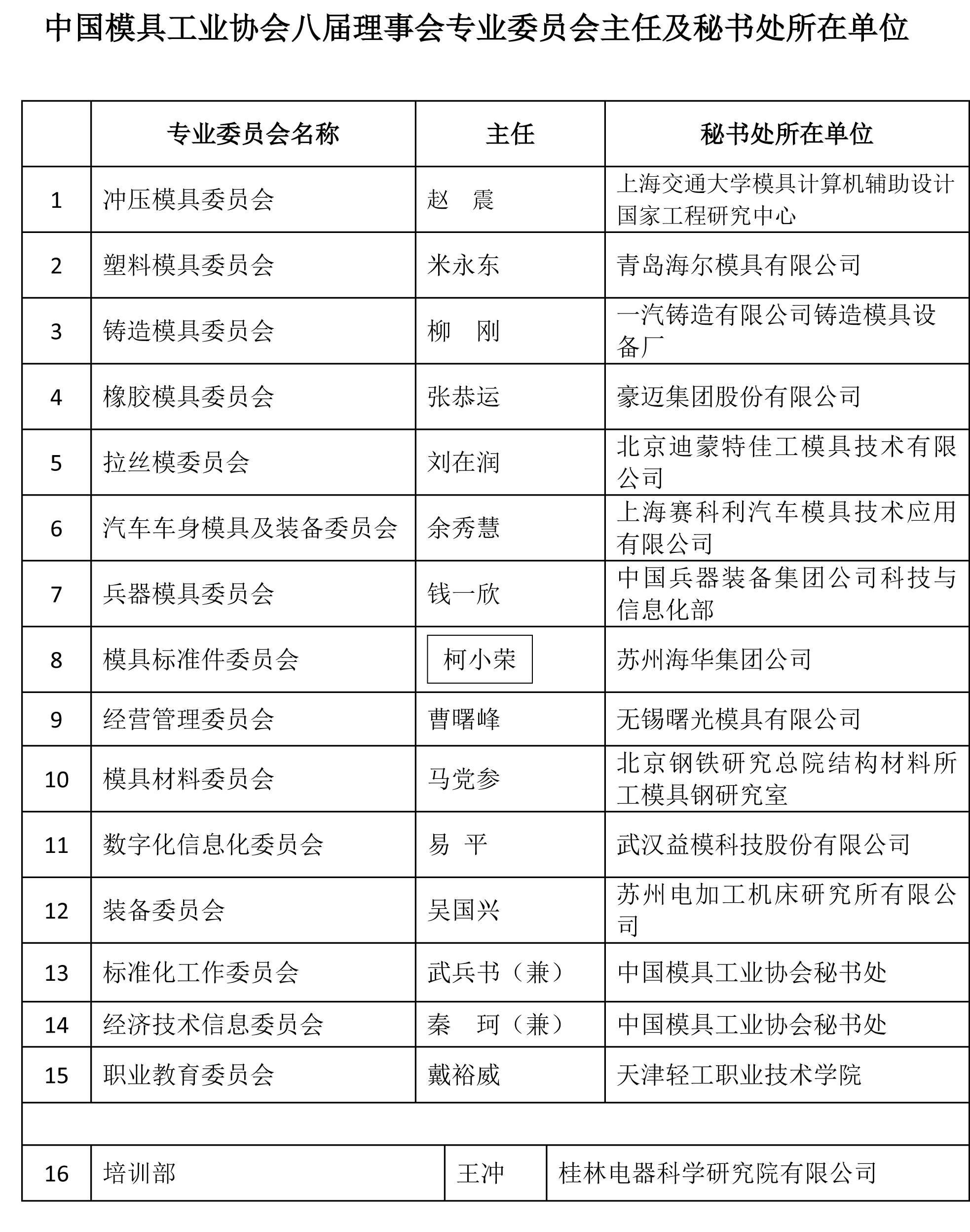 中國模具工業(yè)協(xié)會八屆理事會專業(yè)委員會主任及秘書處所在單位