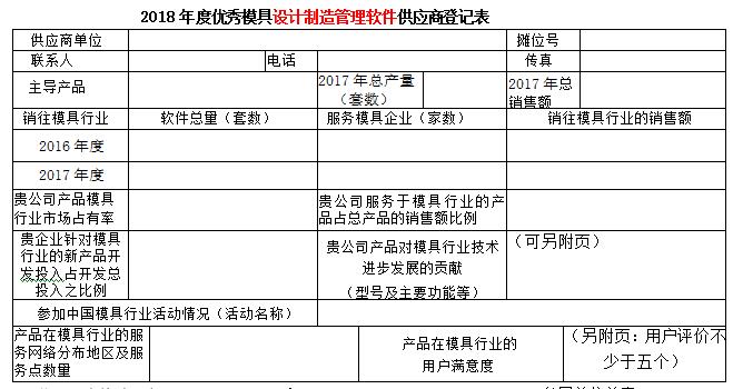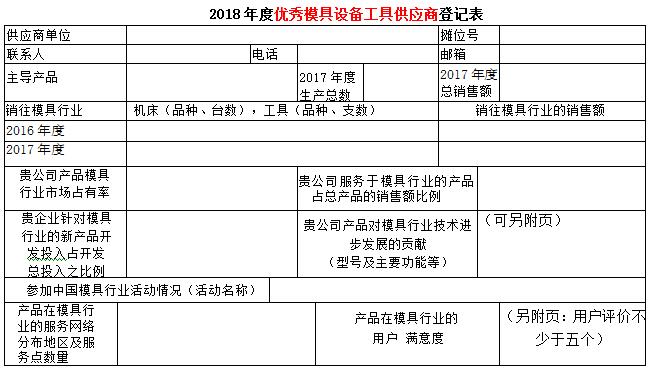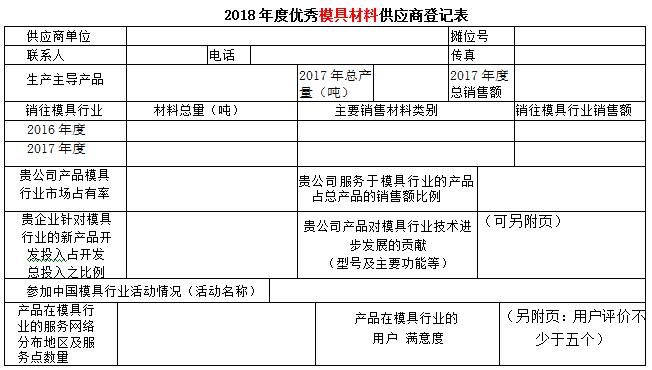 現代模具工業是高技術背景下的資金和技術密集型工業。隨著模具行業的發展,現代模具要實現數字化設計、數字化制造、數字化管理、數字化生產流程來實現模具工業的現代化。模具材料是降本提質增效的重要至關領域,為了服務模具企業提高模具材料使用,提升使用的能力, 第十八屆中國國際模具技術和設備展覽會主辦單位之一的中國模具工業協會十分注重展覽會的內涵,在歷屆展覽會上均開展了對展覽會展品的評述工作,至今已成定式。為了更好地為模具企業提供多元的服務,為企業的模具制造加工解決方案提供保障,進一步推動模具及模具相關行業交流與互動,在第十八屆中國國際模具技術和設備展覽會期間,中國模具工業協會委托中國模具工業協會模具材料委員會,本著自愿的原則,依據供應商裝備水平,在模具行業服務水平、市場占有率的高低、對模具行業服務滿意等行業貢獻指標,并結合模具企業的意見開展評定優秀模具材料供應商活動,活動不收取參評單位任何費用。現將優秀模具材料供應商登記表發給你們,請予認真填寫,盡快返回中國模具工業協會模具材料委員會    遲宏宵  收。