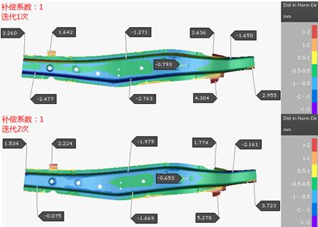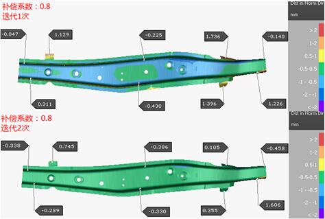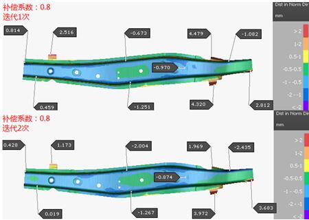 再次嘗試進行補償系數為0.8的補償,其補償后的回彈結果如圖10所示,由回彈補償的結果可知,兩次迭代的補償效果均比補償系數為1的效果好,但是零件的法蘭區域的回彈還是較大,還需要改善。再嘗試用補償系數為0.9、1.1和1.2來進行補償,補償效果均不如補償系數為0.8的,所以最終確定選用0.8作為最佳的補償系數來進行其它方案的補償