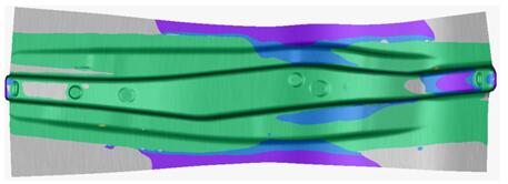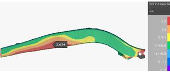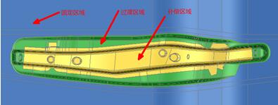 (2)根據零件的特點和前期CAE分析得出的回彈結果,制定合理的回彈補償方案,并運用CAE反向回彈補償技術對模具型面進行補償,補償后CAE驗證回彈均在要求的+-0.5mm之內,有效的解決高強度鋼板回彈大的問題;