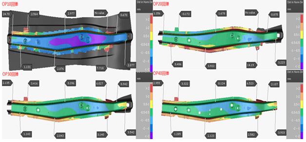 零件的全工序分析通過后,對零件進行回彈分析。首先對零件進行自由回彈分析來判斷零件的回彈趨勢,零件從第一工序到第四工序的回彈結果如圖7所示。由圖可知,零件各工序的回彈趨勢比較一致;在OP10拉延成形后,零件有幾個局部區域的回彈較大,主要集中在零件的兩端和側壁位置;經過OP20切邊之后由于應力釋放使側壁的回彈值有所上升,其它位置的回彈變化不大;零件在OP30整形后側壁的回彈值有減少趨勢,但兩端的回彈值增加,特別是零件前端的法蘭部分;零件在OP40進行局部的切邊和沖孔,該工序屬于零件的應力釋放過程,回彈值變化不大。