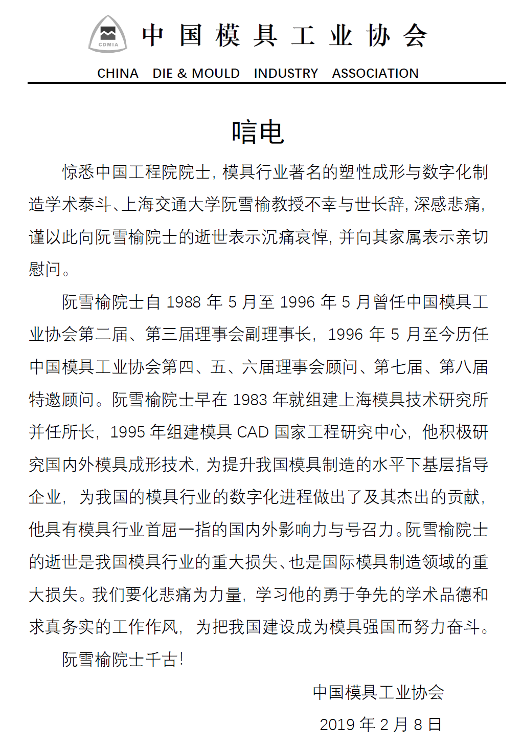 2月11日在滬阮院士告別儀式,李建軍副會長和趙震副會長都代表中國模協(xié)致意阮院士家屬,寄托我們中國模具行業(yè)的哀思。中國模協(xié)送了花圈也發(fā)了唁電。