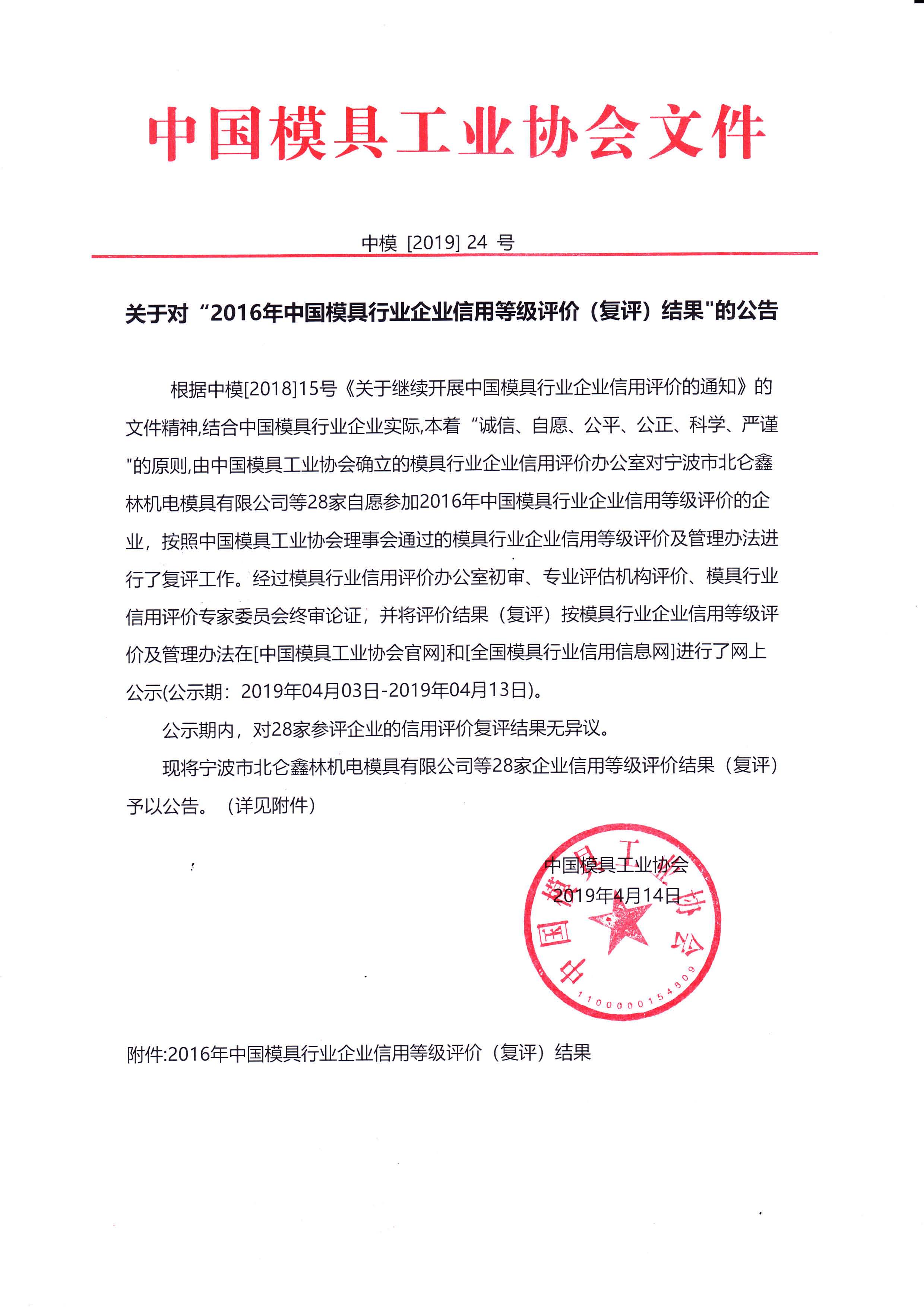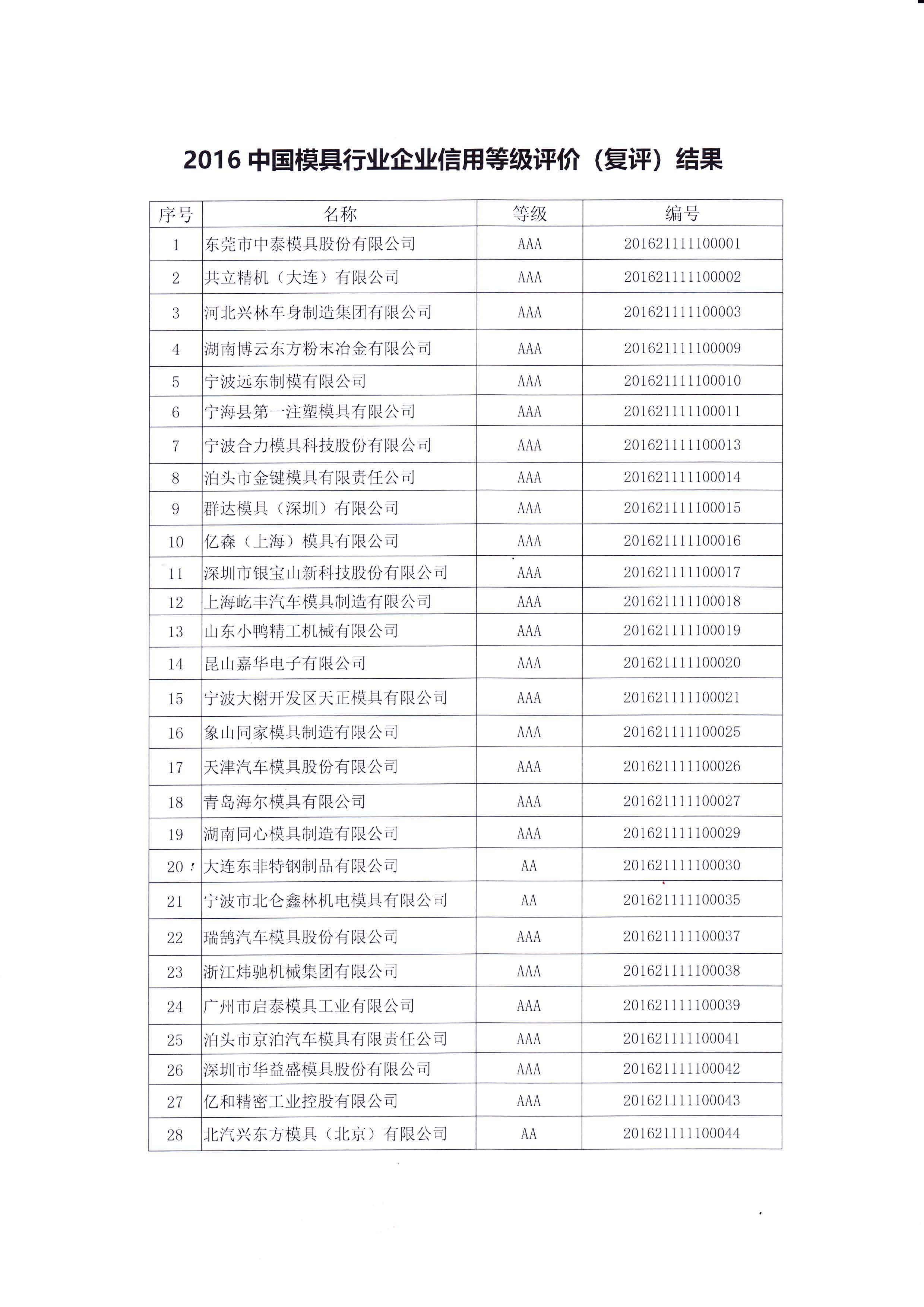 關于對“2016年中國模具行業企業信用等級評價(復評)結果”的公告