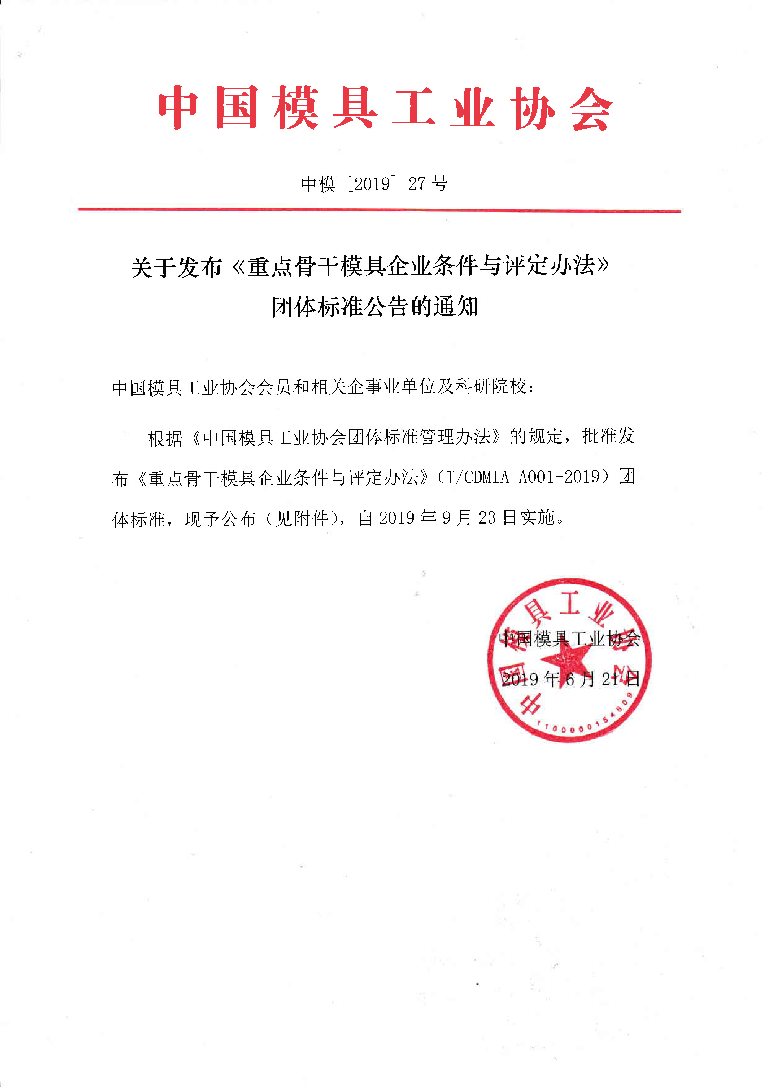 關(guān)于發(fā)布《重點(diǎn)骨干模具企業(yè)條件與評(píng)定辦法》團(tuán)體標(biāo)準(zhǔn)公告的通知
