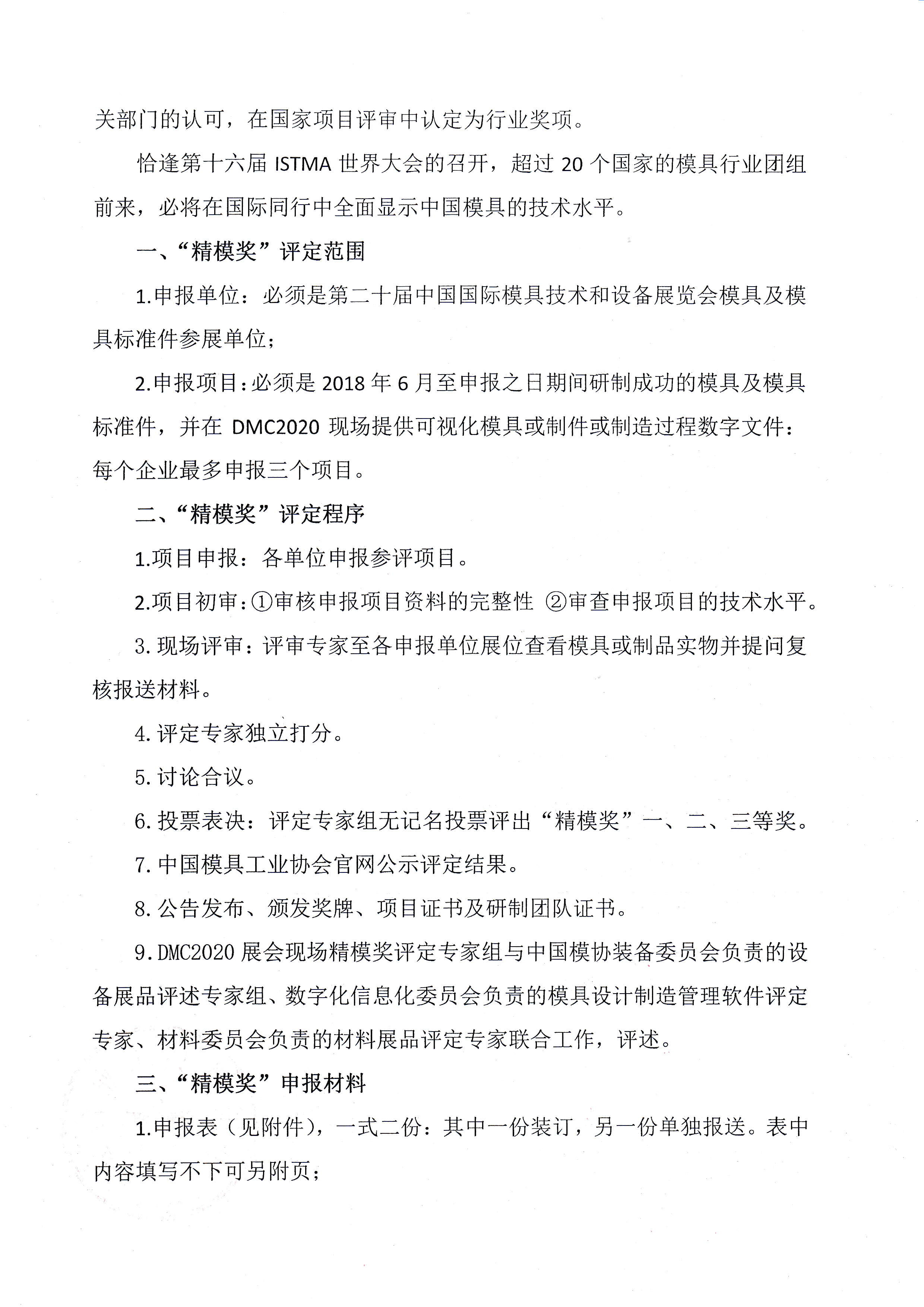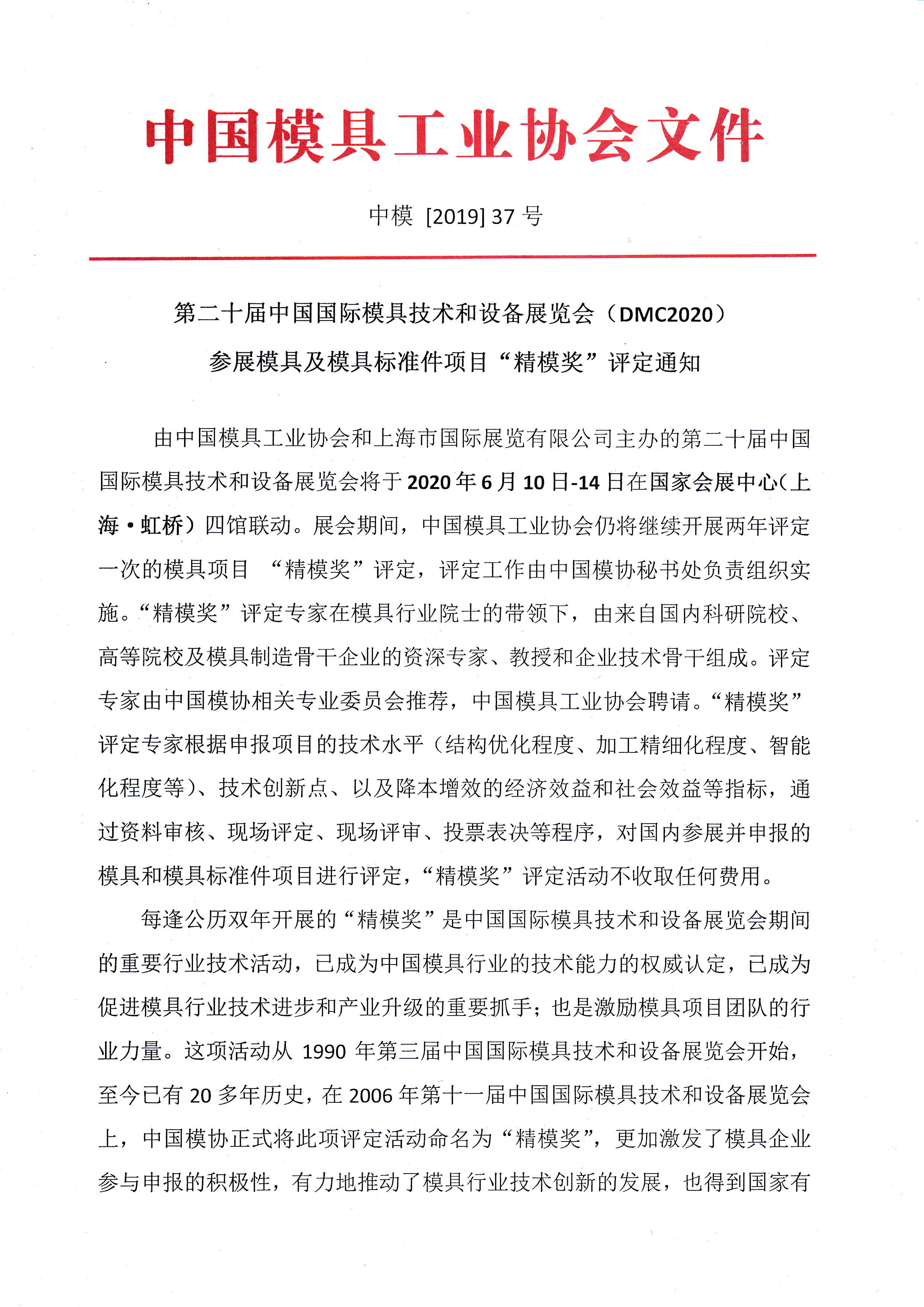 第二十屆中國國際模具技術和設備展覽會(DMC2020)參展模具及模具標準件項目“精模獎”評定通知