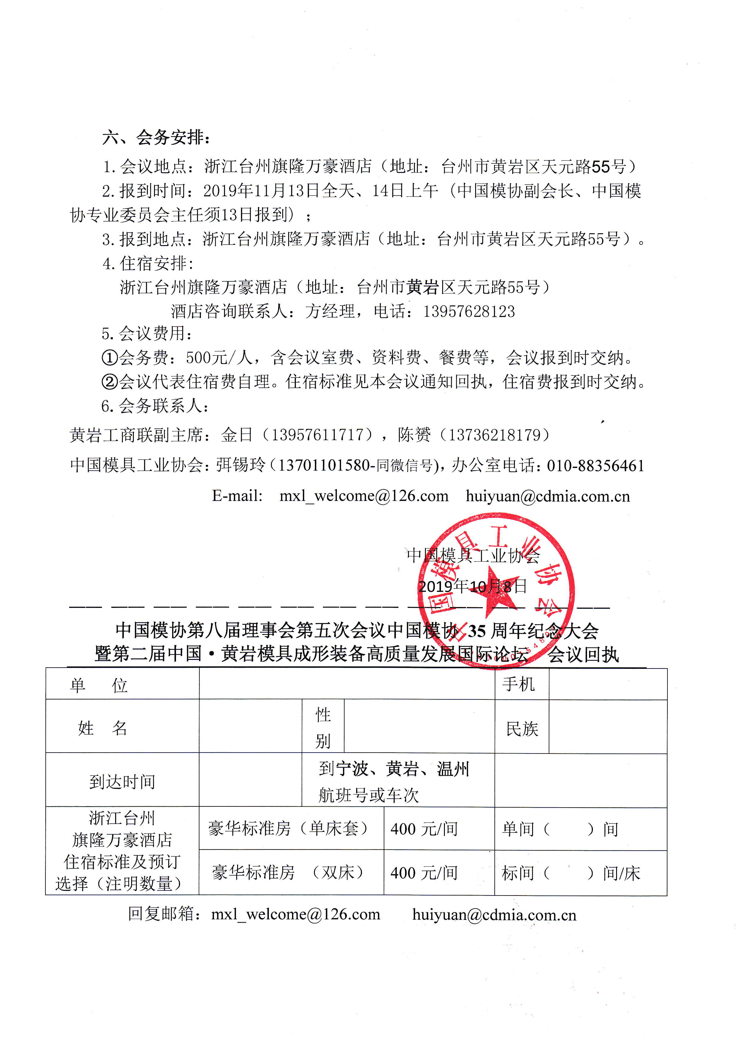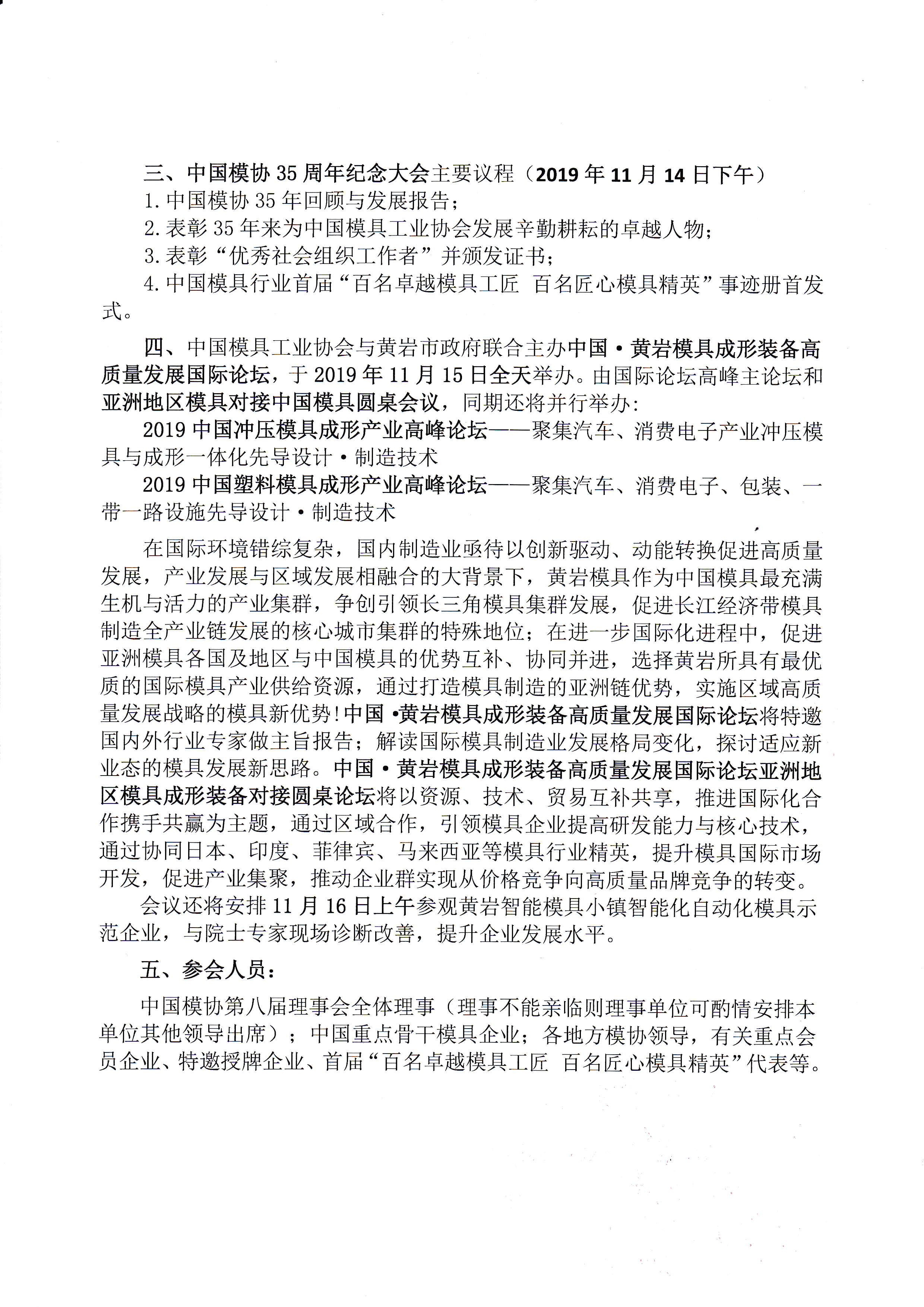 中國模具工業協會八屆理事會第五次會議 中國模具工業協會35周年紀念大會暨第二屆中國黃巖模具裝備高質量發展國際論壇系列會議通知