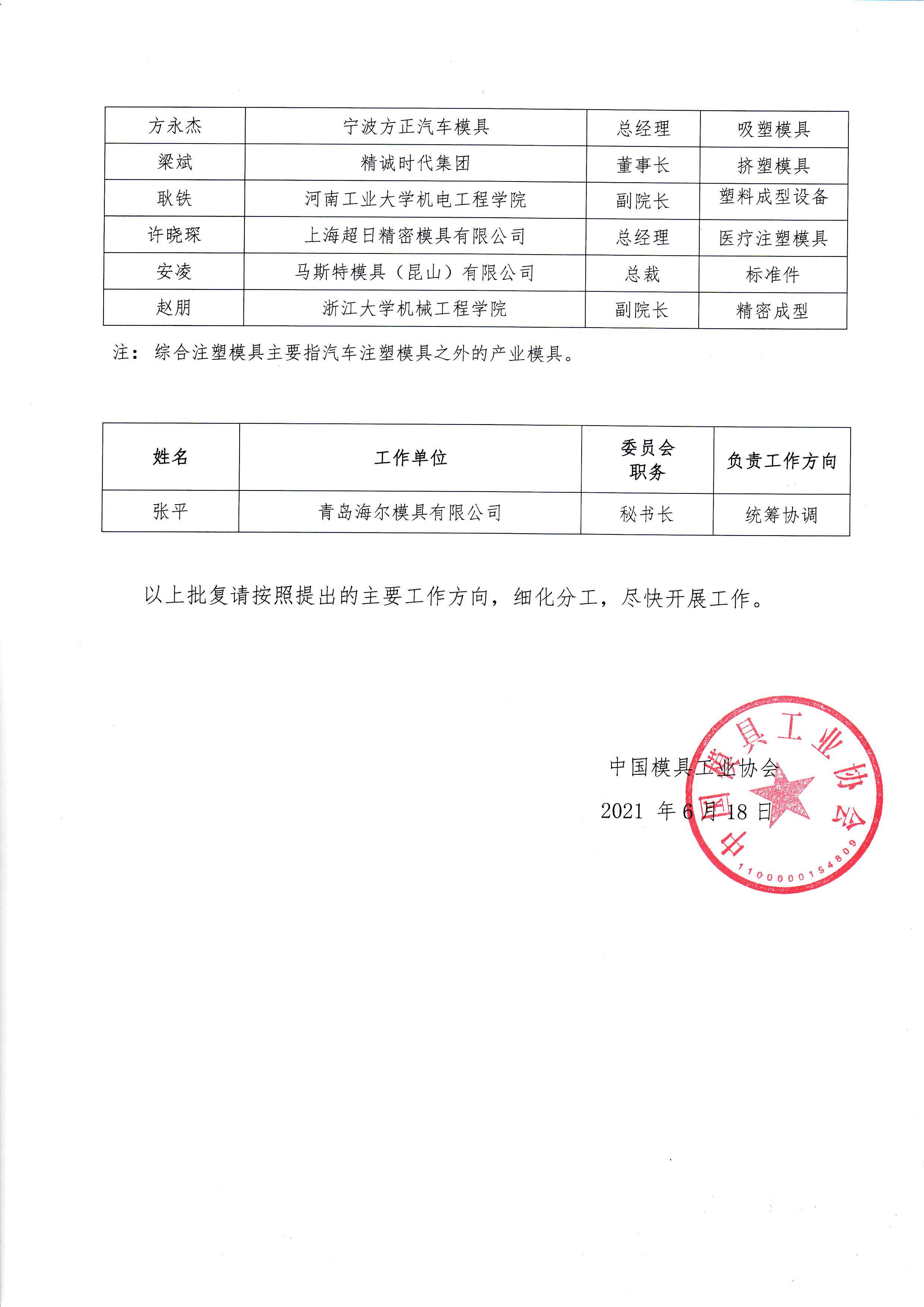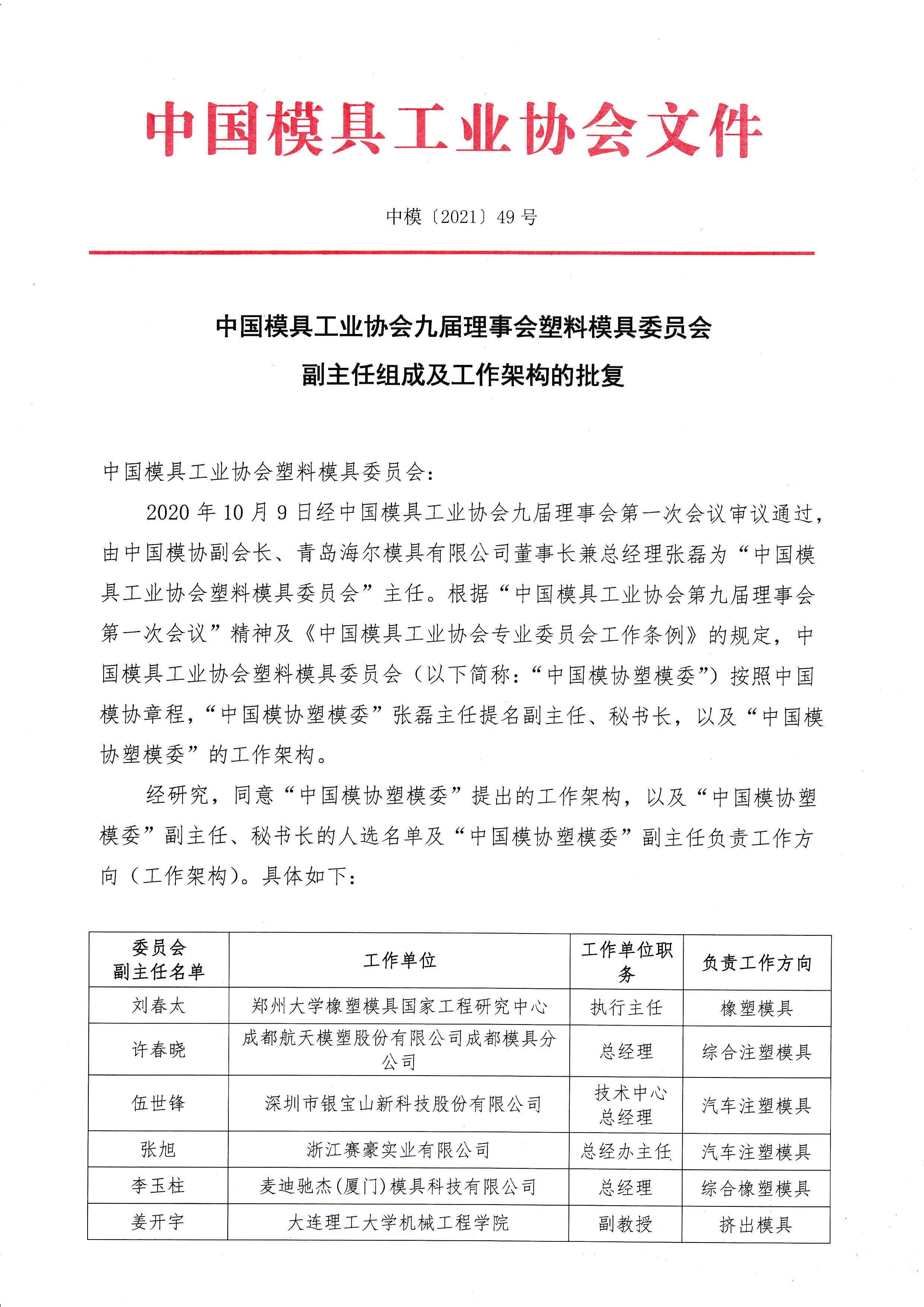 中國(guó)模協(xié)九屆理事會(huì)塑料模具委員會(huì)副主任組成及工作架構(gòu)的批復(fù)