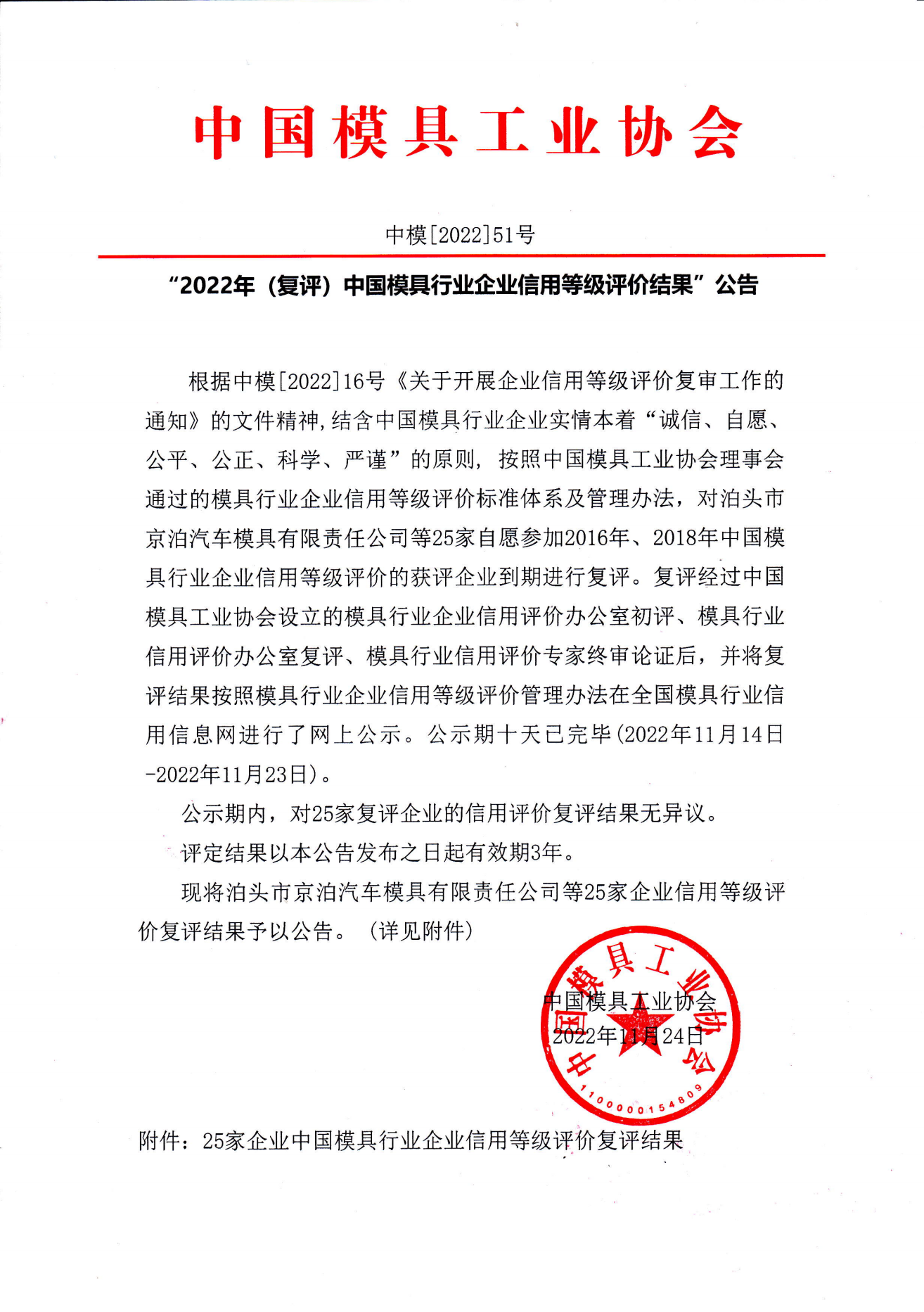 附件:25家企業(yè)中國(guó)模具行業(yè)企業(yè)信用等級(jí)評(píng)價(jià)復(fù)評(píng)結(jié)果