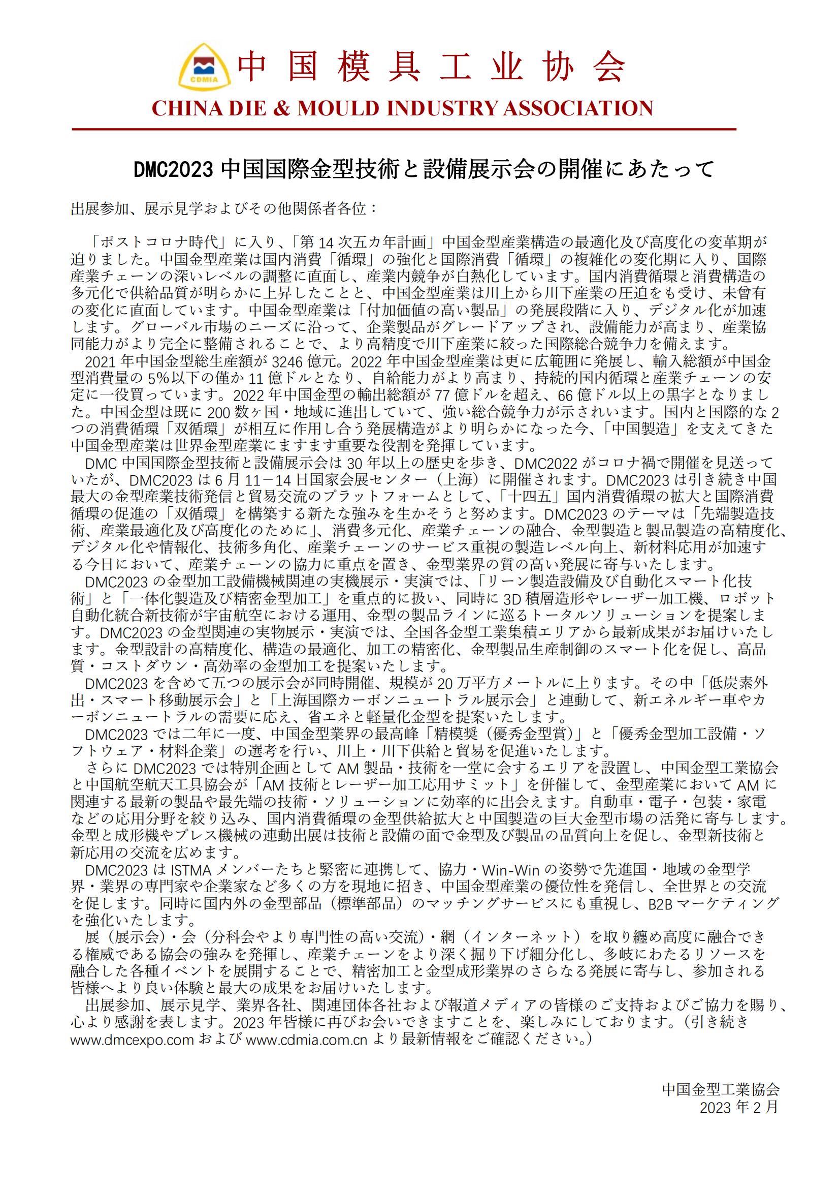 DMC2023 中國國際金型技術(shù)と設(shè)備展示會の開催にあたって
