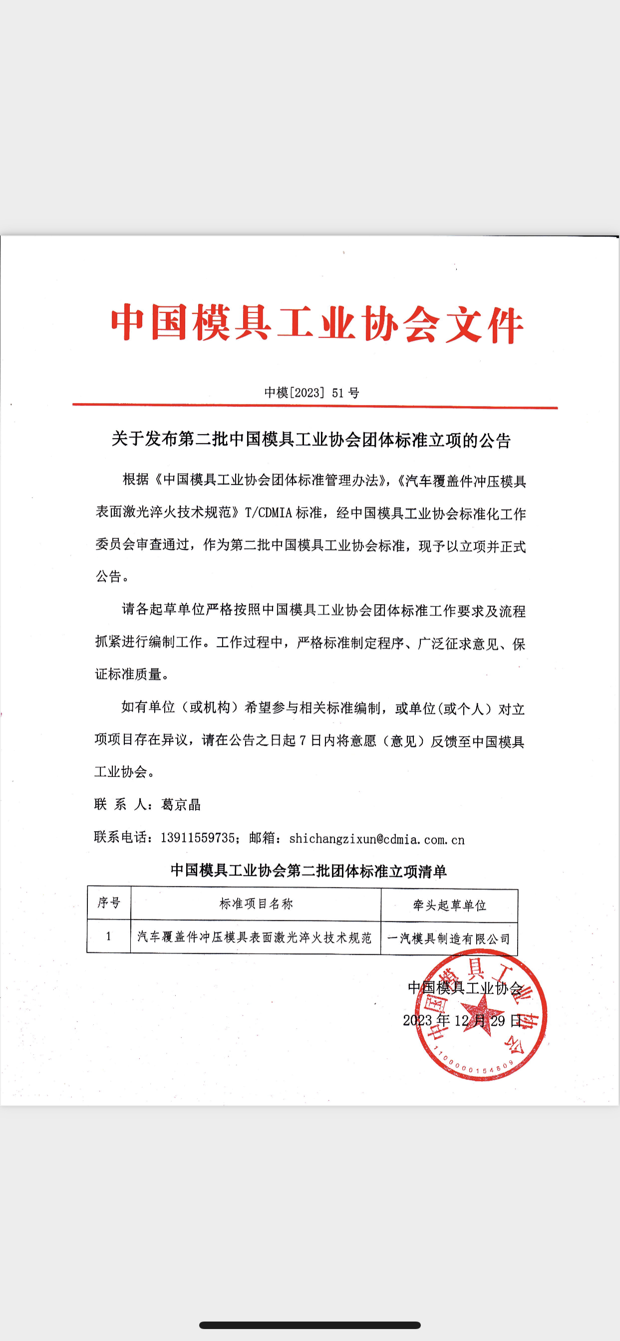 第二批中國模具工業協會團體標準立項公告