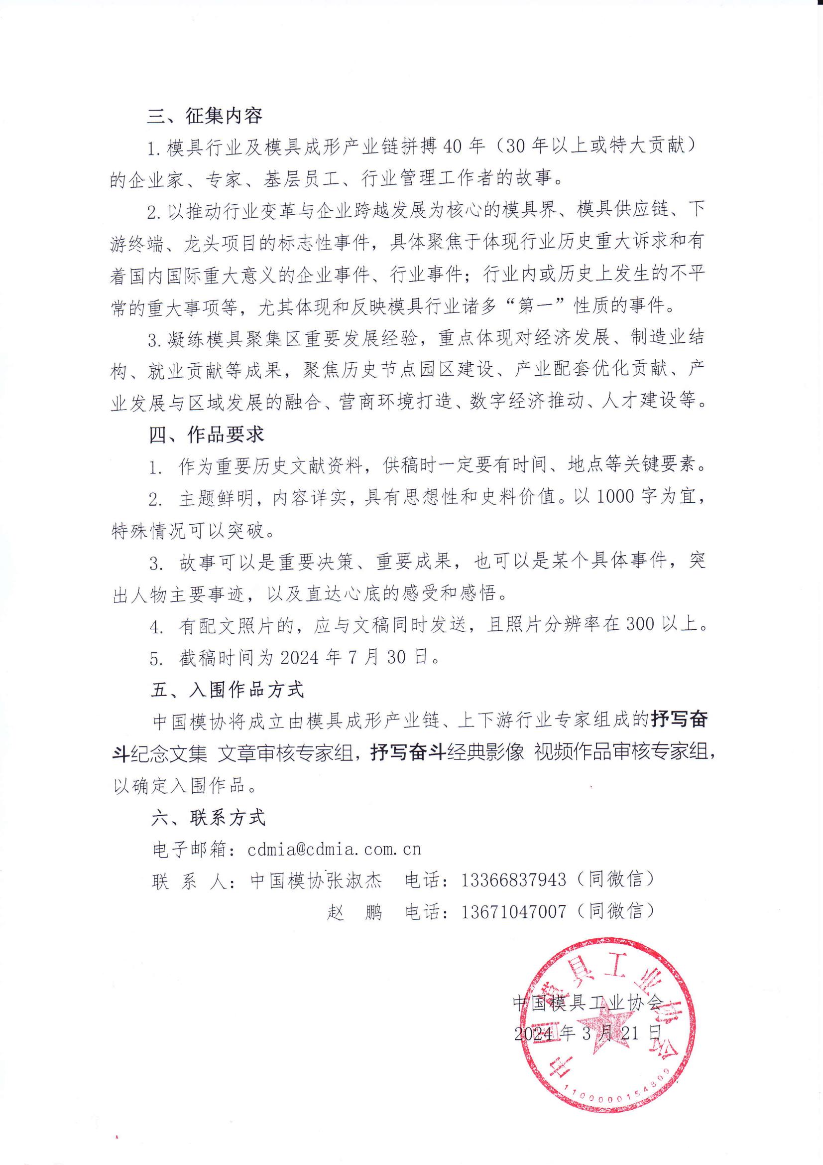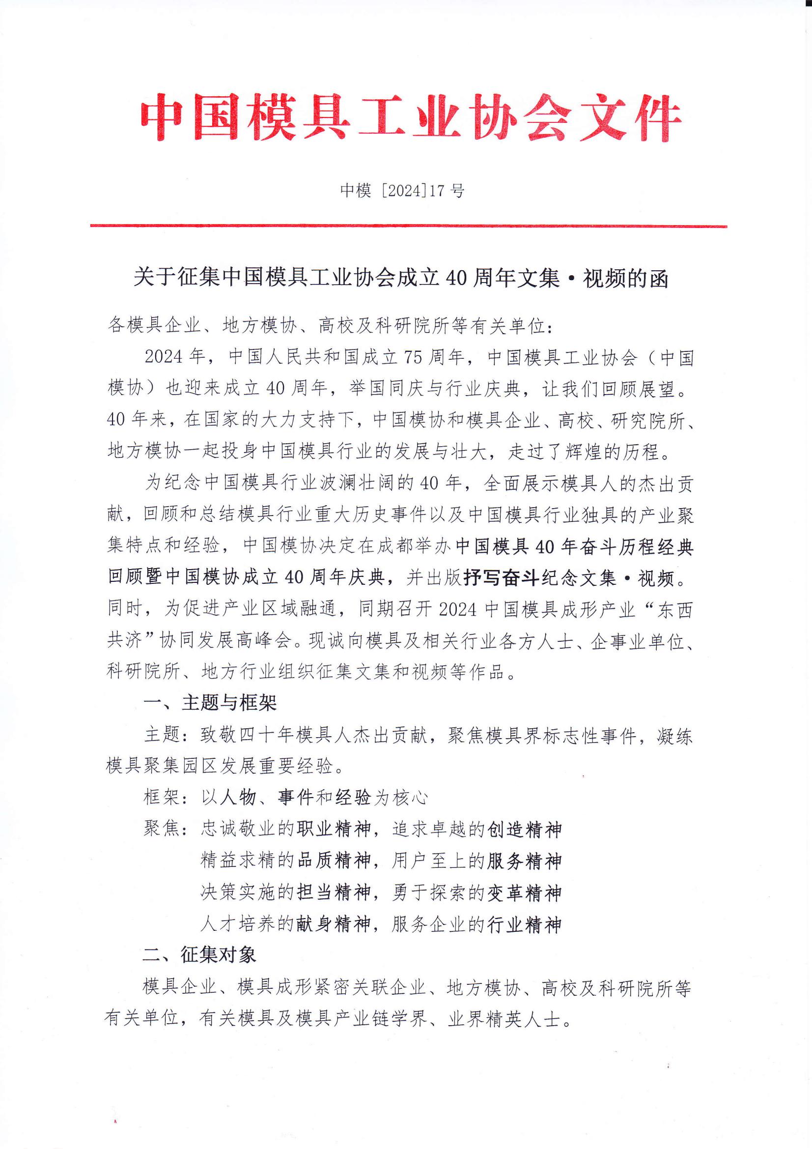 關于征集中國模具工業(yè)協(xié)會成立40周年文集 視頻的函
