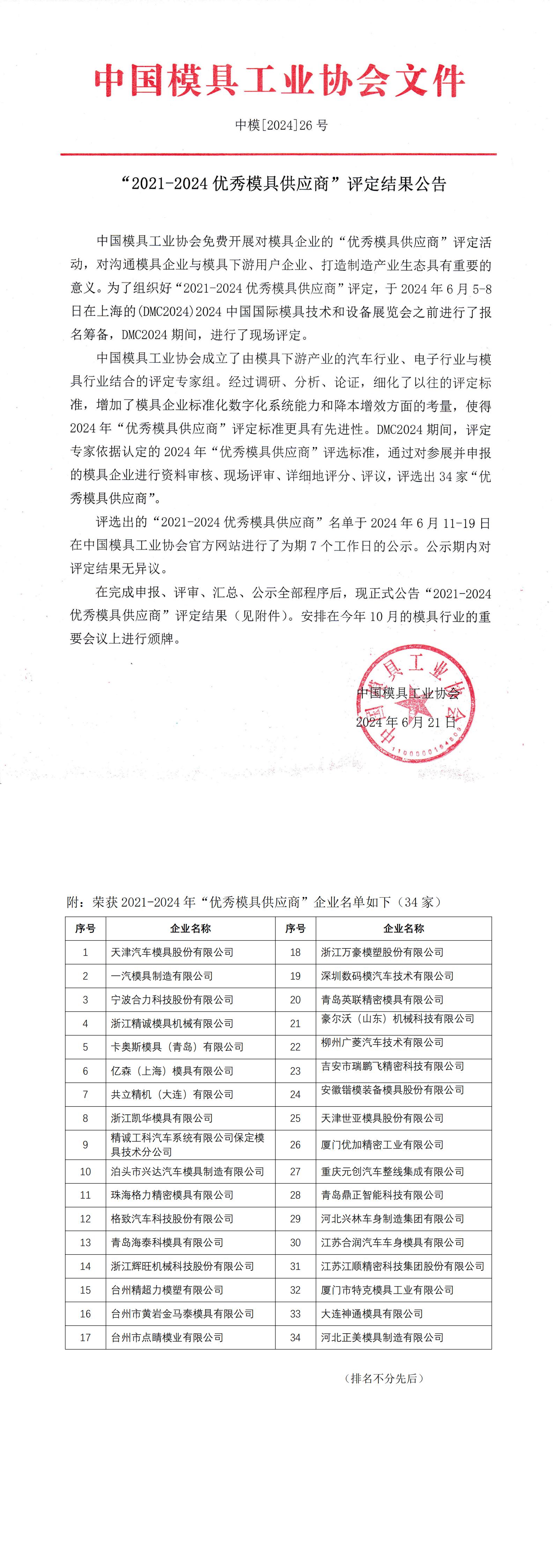 “2021-2024優秀模具供應商”評定結果公告