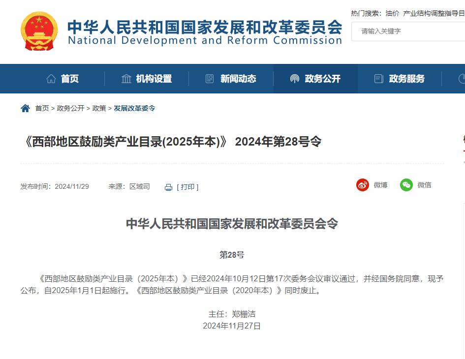 《西部地區(qū)鼓勵(lì)類產(chǎn)業(yè)目錄(2025年本)》 2024年第28號(hào)令