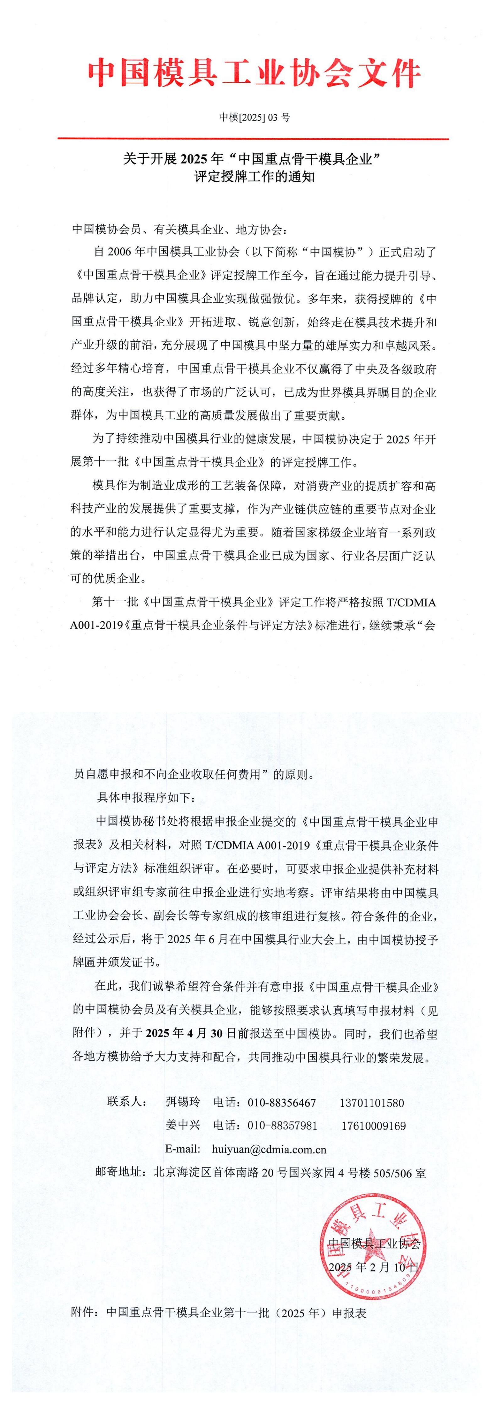 關(guān)于開(kāi)展2025年“中國(guó)重點(diǎn)骨干模具企業(yè)”評(píng)定授牌工作的通知