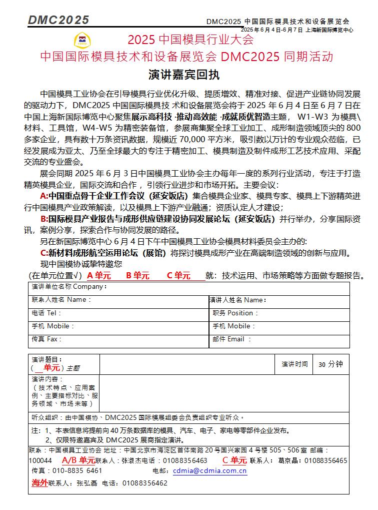 DMC2025中國(guó)模具行業(yè)大會(huì)演講嘉賓回執(zhí)